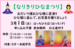 おだいり様、おひな様🎎に変身👀⁉✨ひな壇に並んでお写真を撮りましょう💓赤ちゃんから大歓迎🌈みなさまのご参加待ってます😊